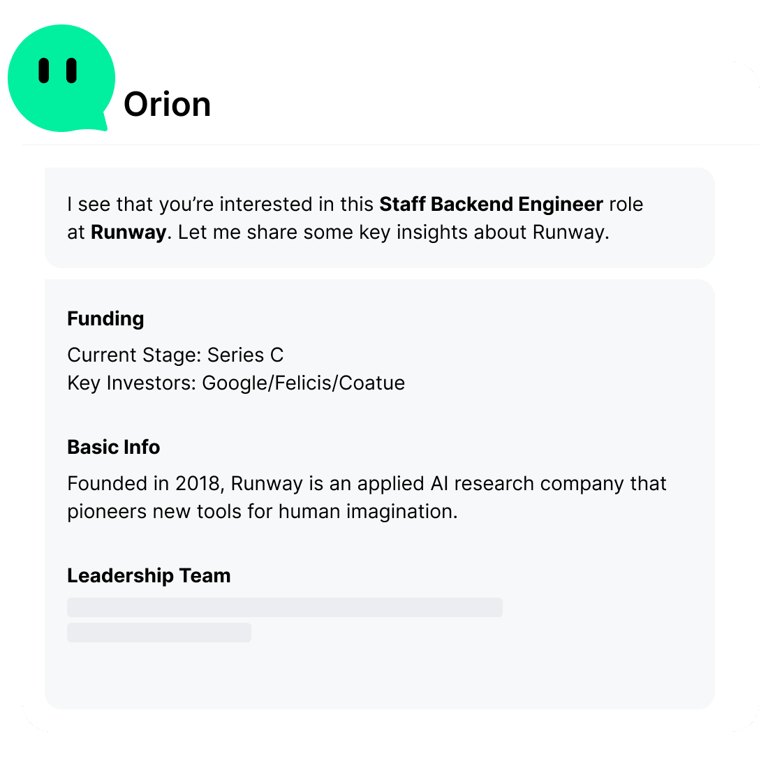 Orion tailors its recommendations by analyzing the information you provide about your career goals, skills, experience, and preferences based on your onboarding questions, resume, and as much information you provide Orion.